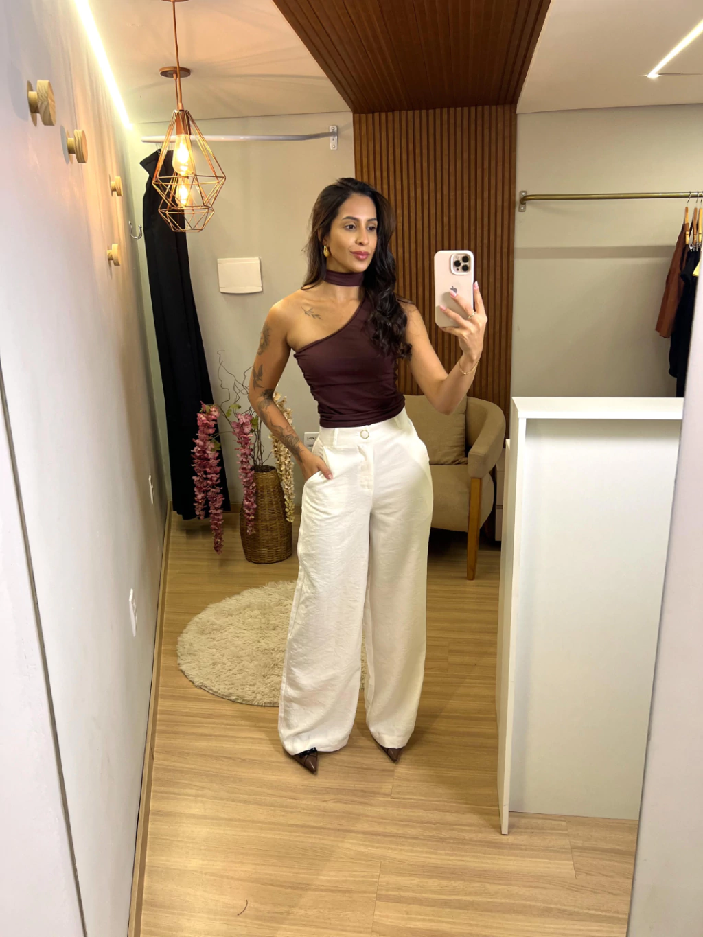 Calça de cintura alta com modelagem boca de sino, ideal para valorizar a silhueta e trazer um toque sofisticado ao look. Seu corte amplo na barra cria movimento e equilíbrio visual, enquanto o ajuste na cintura garante conforto e firmeza. Possui passantes para cinto, permitindo composições versáteis e charmosas, sendo perfeita tanto para produções casuais quanto para ocasiões formais.